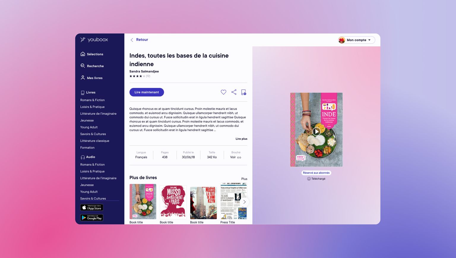 Youboox is an app that allows you to read what you want, where you want. This service is meant to be for all type of readers and includes books, comics, press but also audiobooks. All the content is accessible thanks to a monthly subscription.